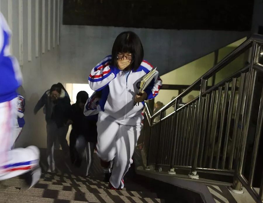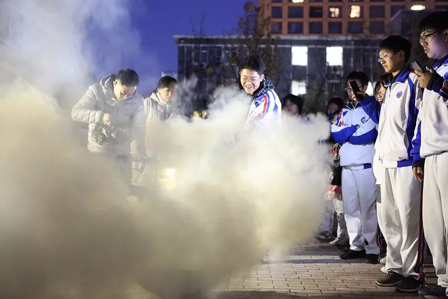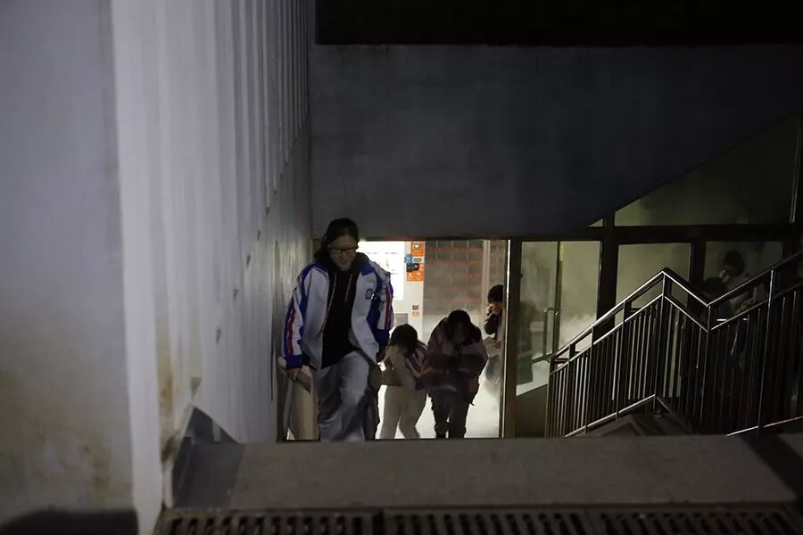 然后,下午5时许随着一声警报,烟雾弹弥漫整个会议室。同学们进行疏散,整个疏散过程迅速有序。人员集体疏散到操场进行人数清点与汇报。